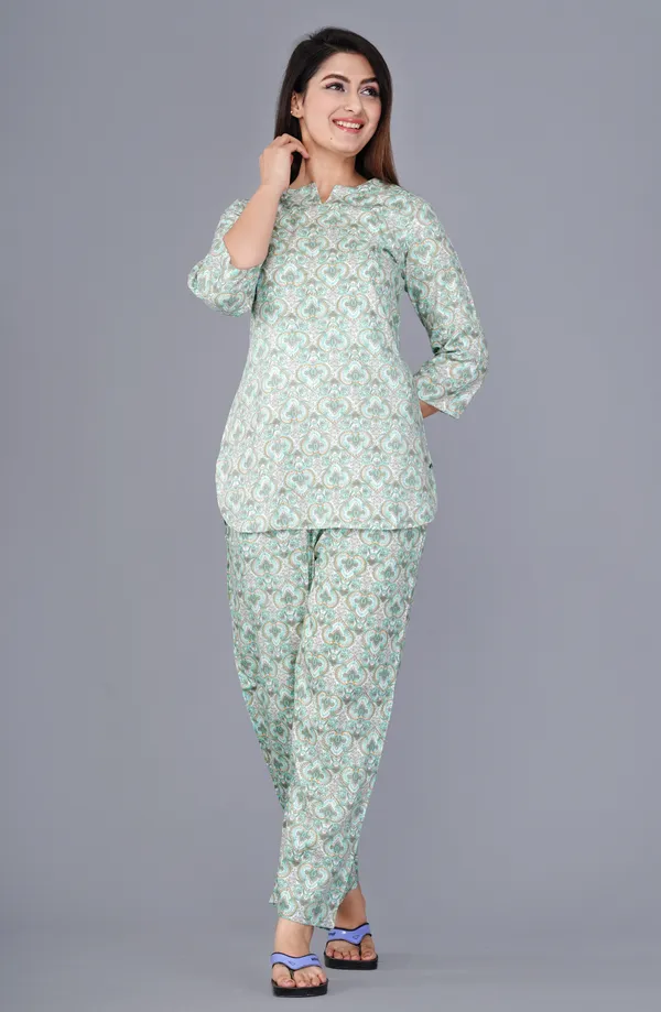 Whether you're lounging at home or getting ready for bed, this night suit set offers a perfect combination of style and ease, providing you with a restful night's sleep and cozy mornings. Ideal for gifting or treating yourself, its available in a variety of elegant colors and patterns.